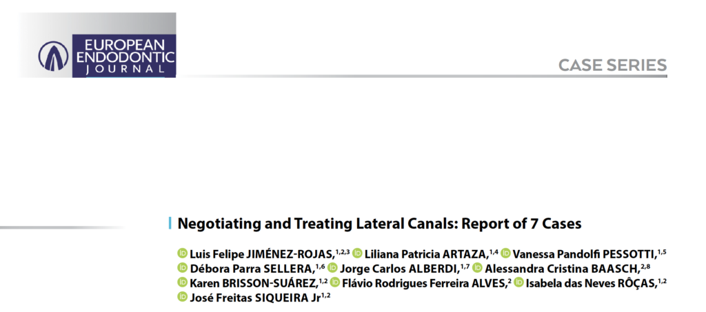 This is a series of 7 cases in which the operator penetrated lateral canals with instruments. Two teeth presented with irreversible pulpitis, 4 with necrotic pulps, and 1 with previous treatment. Except for the teeth with pulpitis, all the others were associated with apical periodontitis. The main root canal was always relatively straight, with the lateral canals at the middle third of the root. Suggestive images of lateral canal presence were seen on periapical radiographs in five cases. The clinician introduced intentionally small hand instruments in the lateral canal in 5 cases, while the penetration was fortuitous in the others. The lateral canals were filled in all cases. Follow-up examination was possible in five cases, all of them showed evidence of successful clinical and radiographic outcomes. Introducing files into lateral canals may permit some preparation and penetration of irrigant solution, favoring disinfection and, consequently, enhancing the treatment outcome.